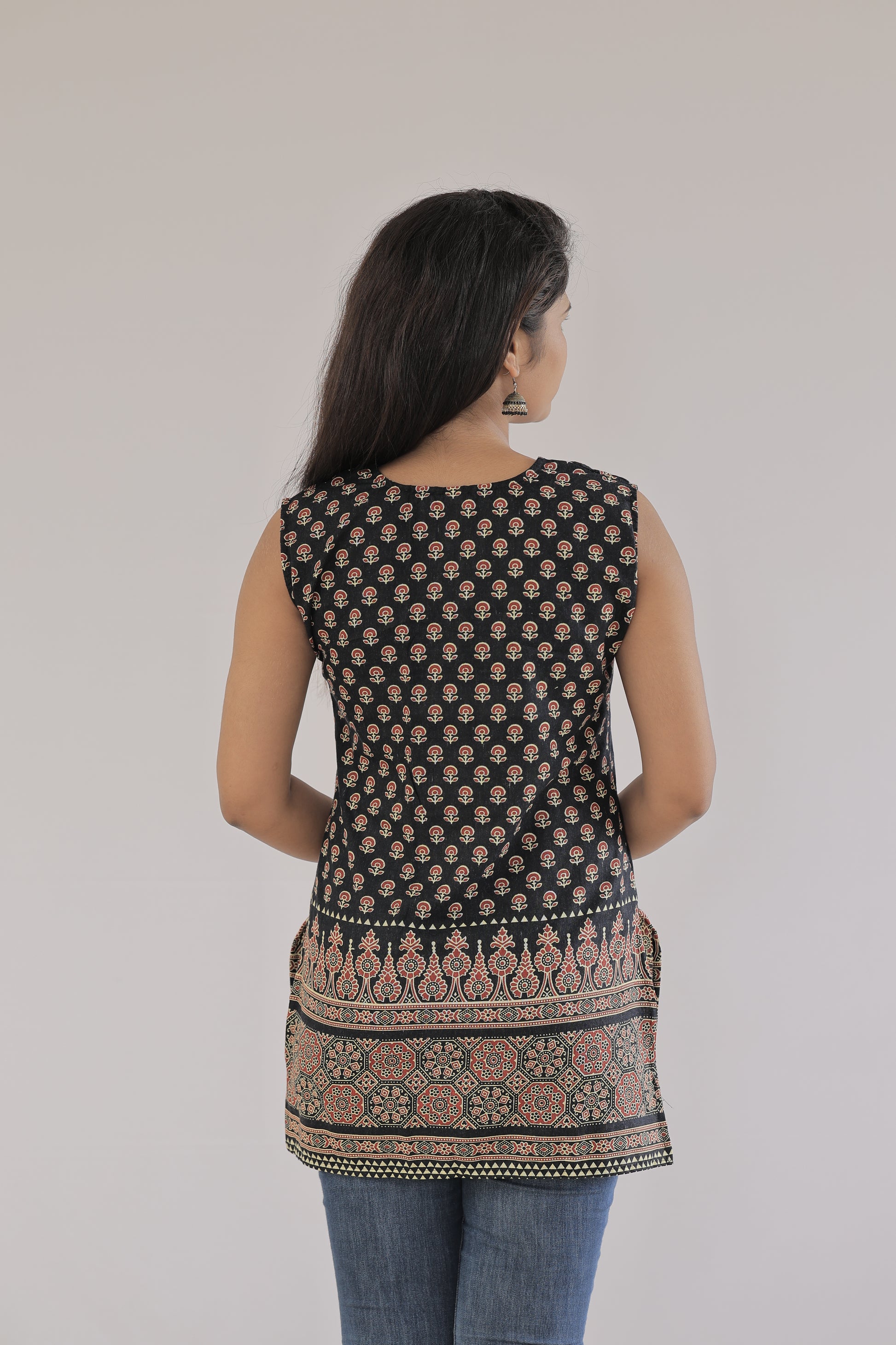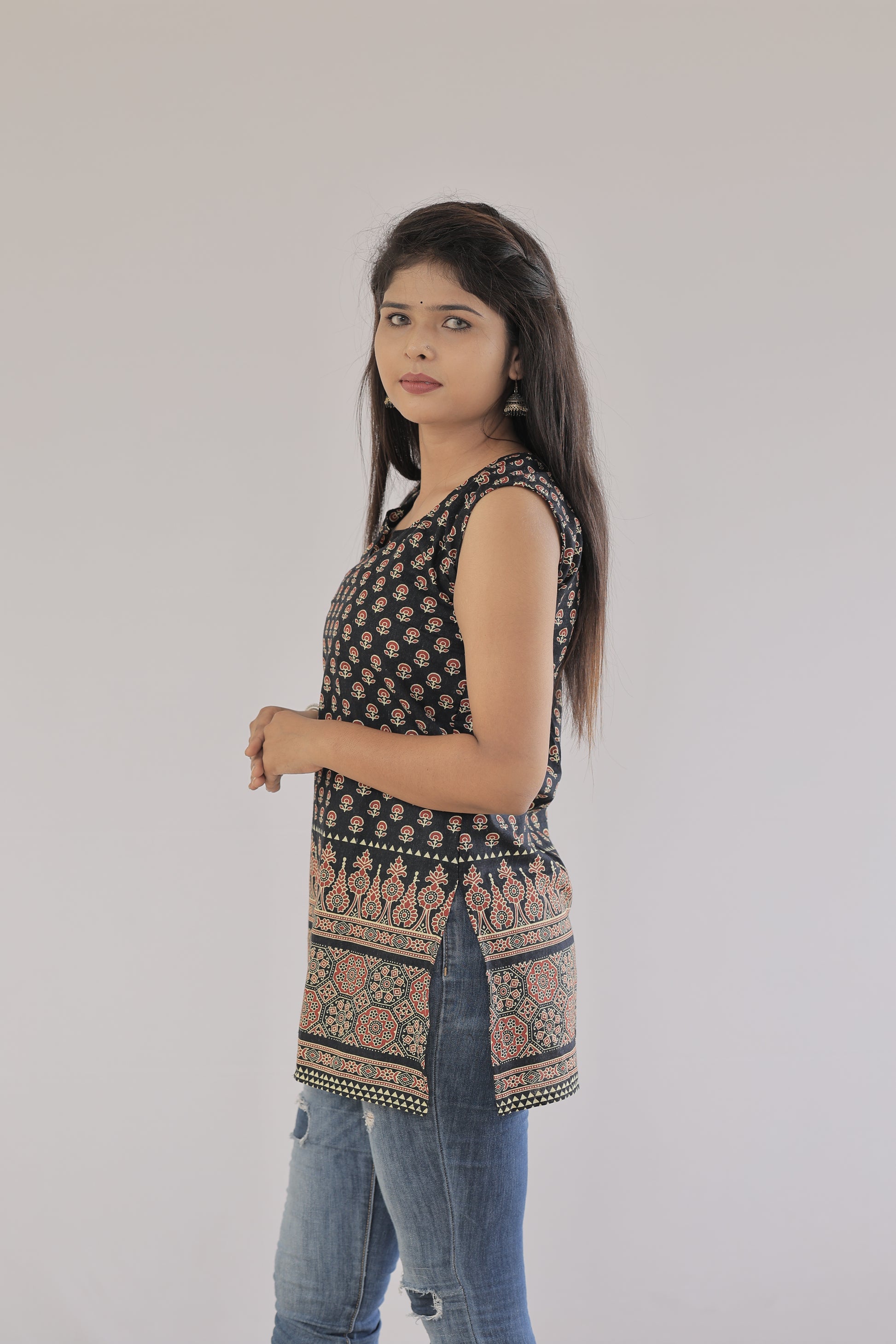 This is a sleeveless printed short kurti designed for casual and semi-ethnic wear. Made from lightweight cotton fabric, it features traditional floral or block prints that give it a charming ethnic touch. The sleeveless design keeps it cool and breathable, making it perfect for summer days. The kurti has a modest round neckline with a notch in the center, and a straight hemline with a decorative border at the bottom. Ideal to pair with jeans, leggings, or palazzos for a stylish Indo-western look in hindi
